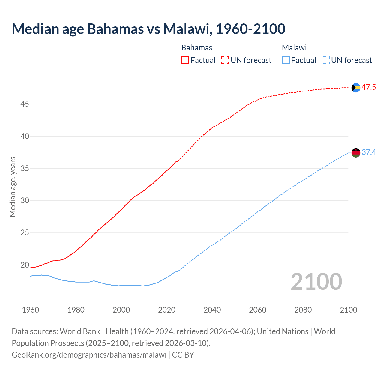 Median age Bahamas vs Malawi, 1960-2100