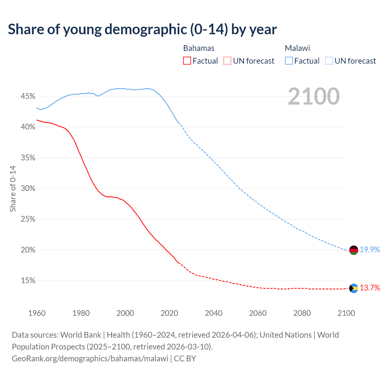 - The share of young demographic (0-15 years old) in the Bahamas is 17.9% vs 40.7% in Malawi.