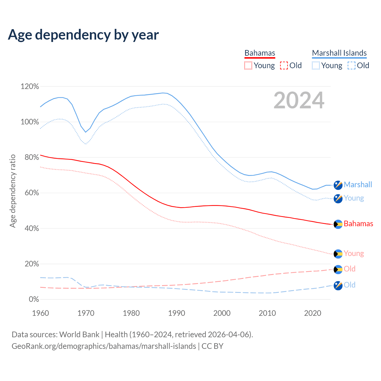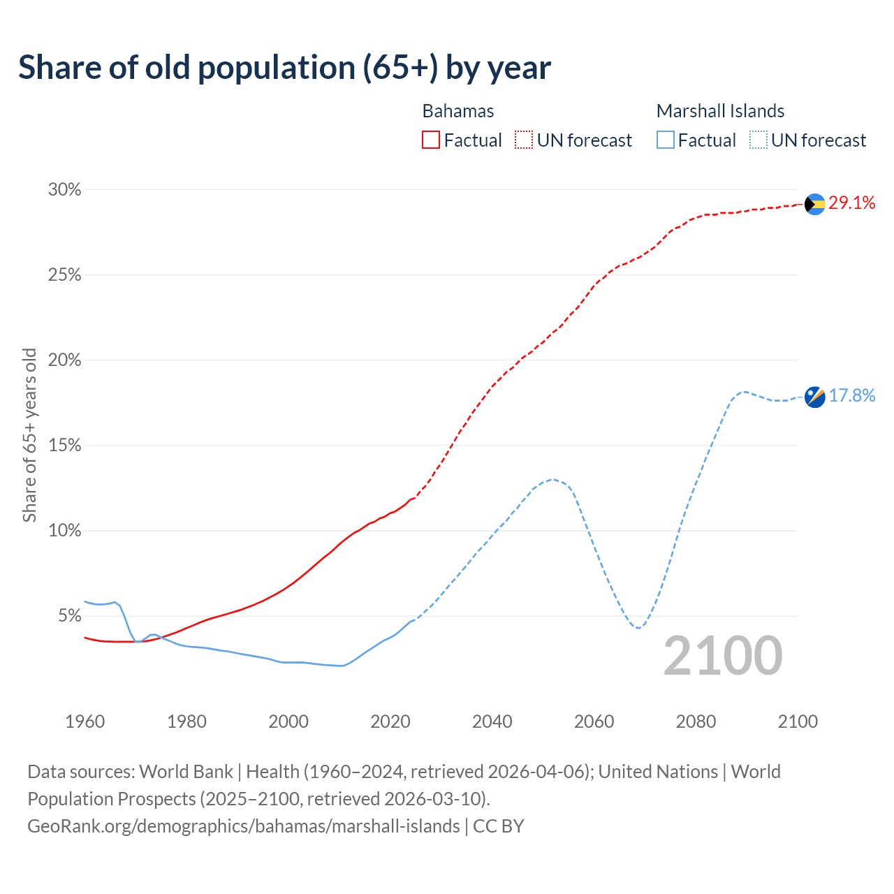 - The share of old-age demographic (65+) in the Bahamas is 11.8% vs 4.64% in the Marshall Islands.