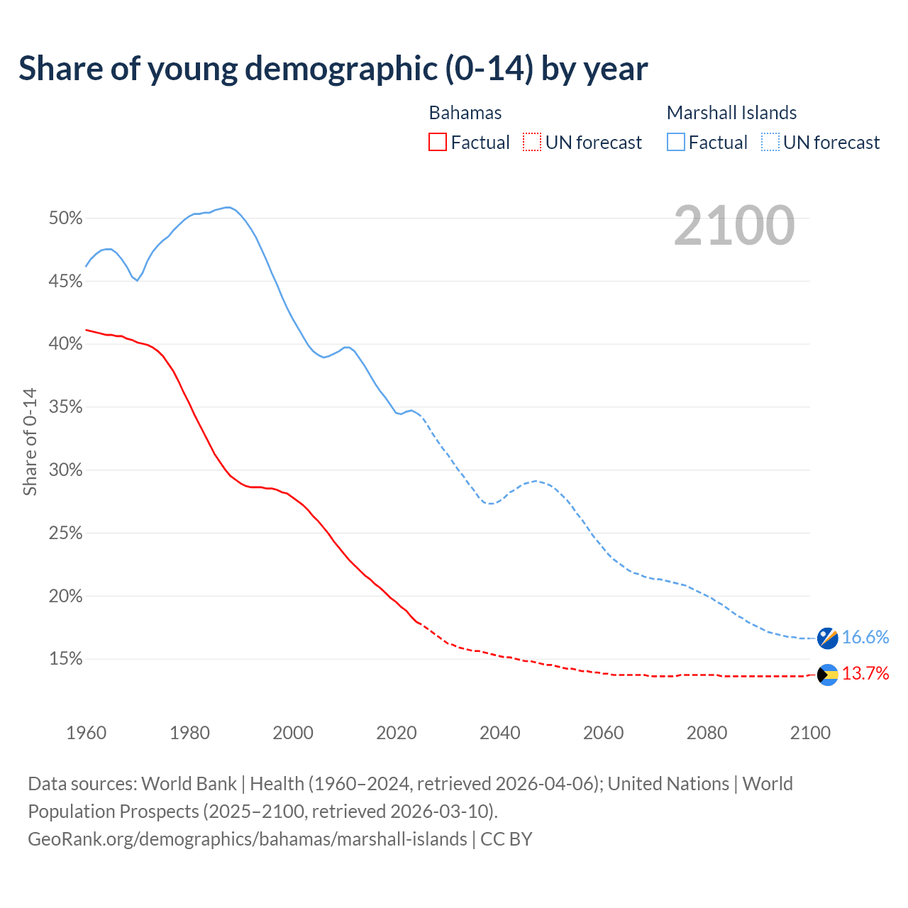- The share of young demographic (0-15 years old) in the Bahamas is 17.9% vs 34.5% in the Marshall Islands.