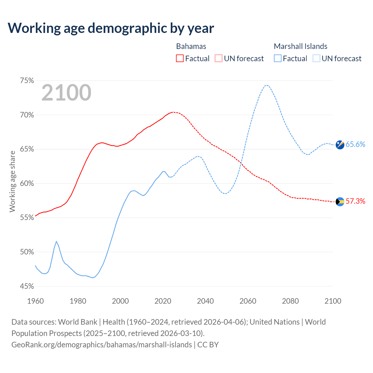 Median age Bahamas vs Marshall Islands, 1960-2100