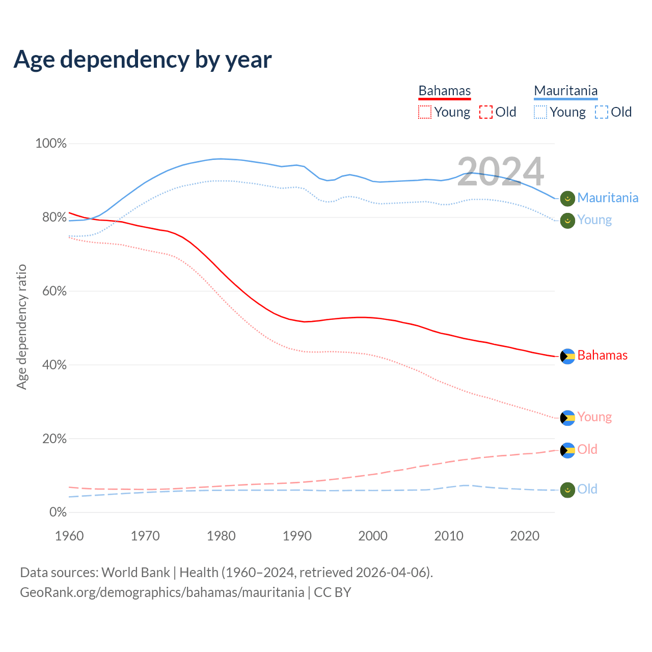 - The share of old-age demographic (65+) in the Bahamas is 11.8% vs 3.23% in Mauritania.