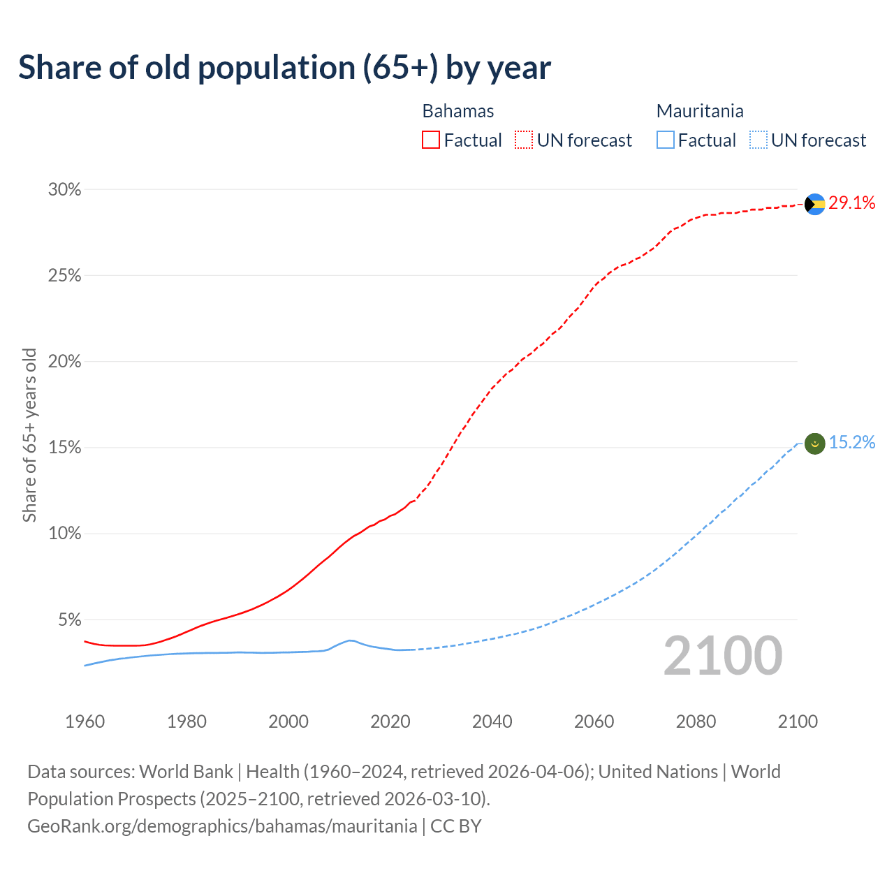 The share of older people aged 65 and over is 11.8% in the Bahamas and 3.23% in Mauritania. Life expectancy in the Bahamas compared to Mauritania .