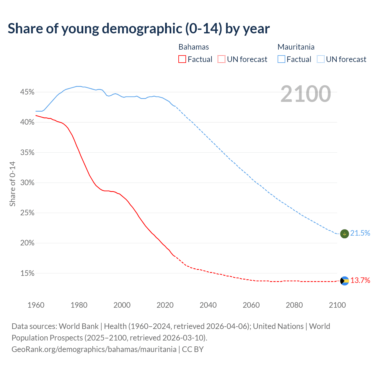 - The share of young demographic (0-15 years old) in the Bahamas is 17.9% vs 42.7% in Mauritania.