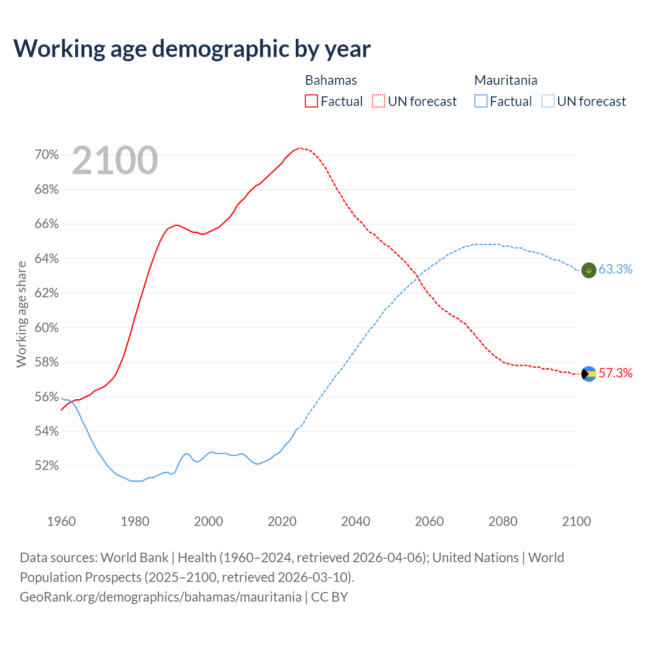 - The Bahamas has 285K working age adults (aged 15-64) vs 2.98M in Mauritania.