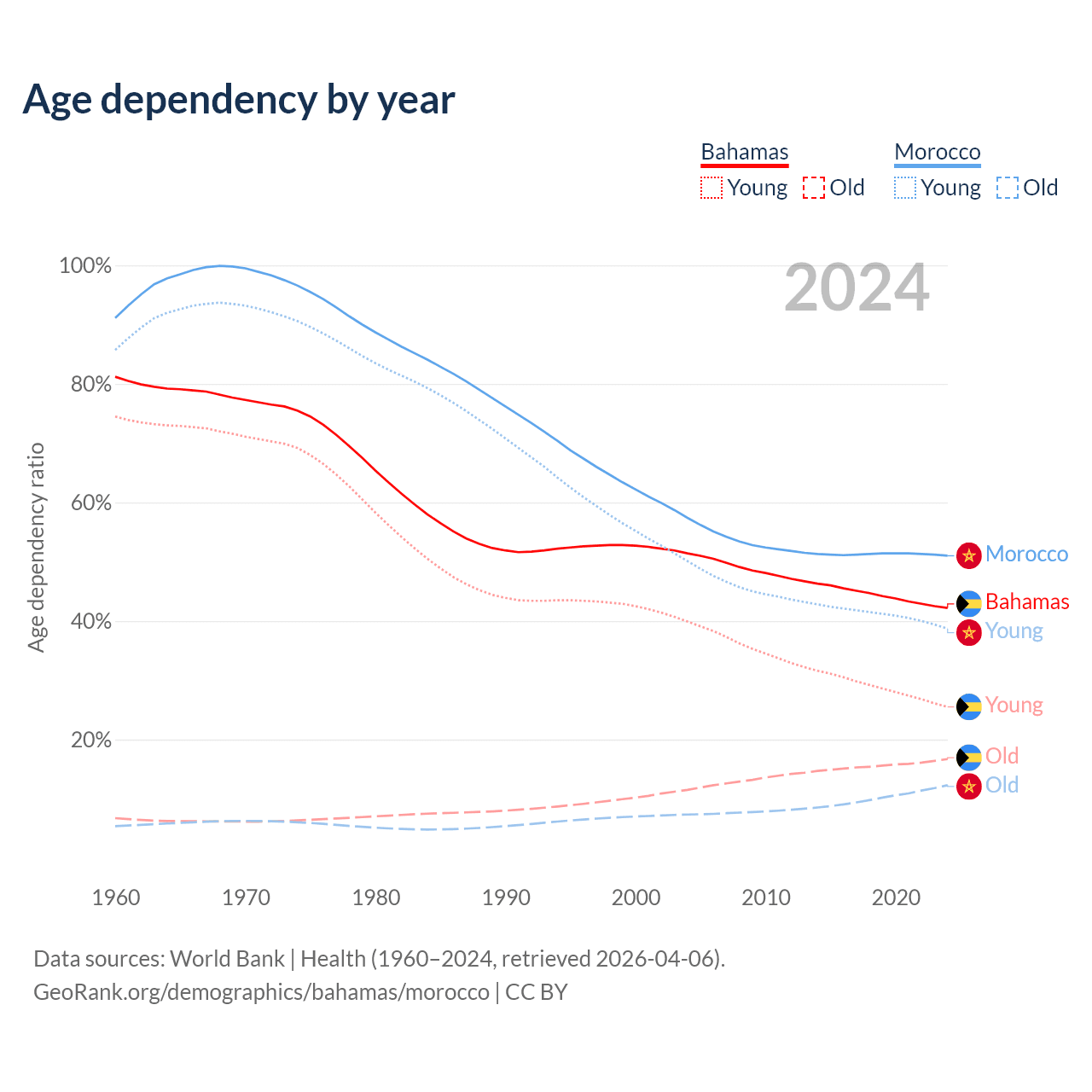 - The share of old-age demographic (65+) in the Bahamas is 11.8% vs 8.14% in Morocco.