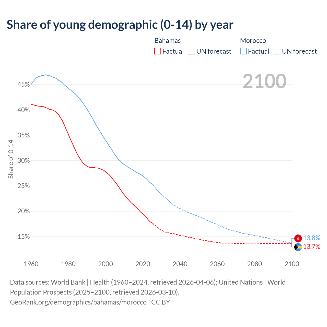 - The share of young demographic (0-15 years old) in the Bahamas is 17.9% vs 25.6% in Morocco.