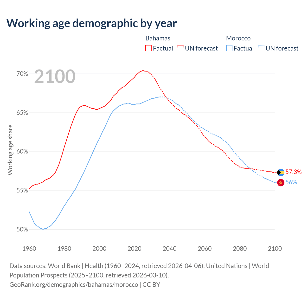 - The Bahamas has 285K working age adults (aged 15-64) vs 25.7M in Morocco.