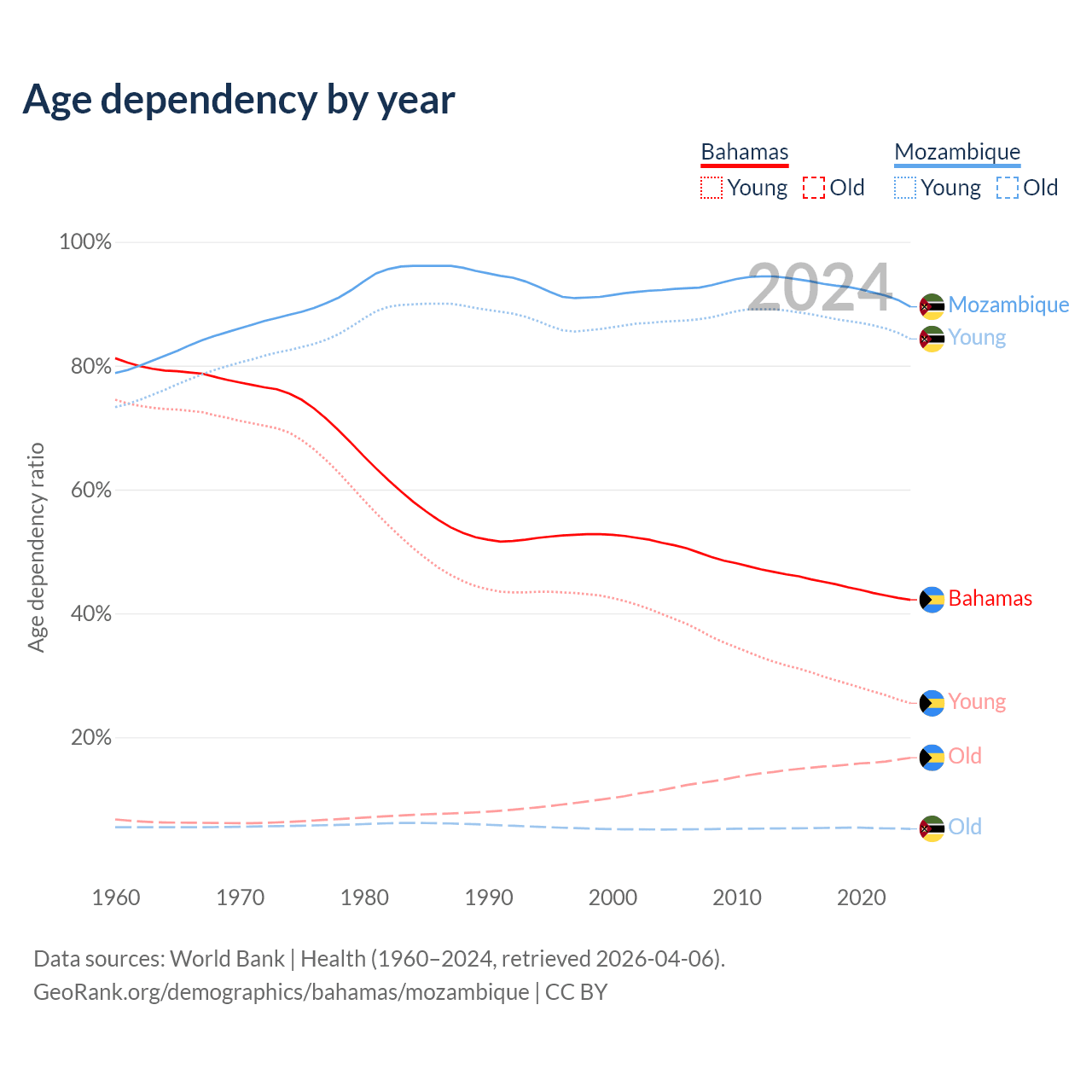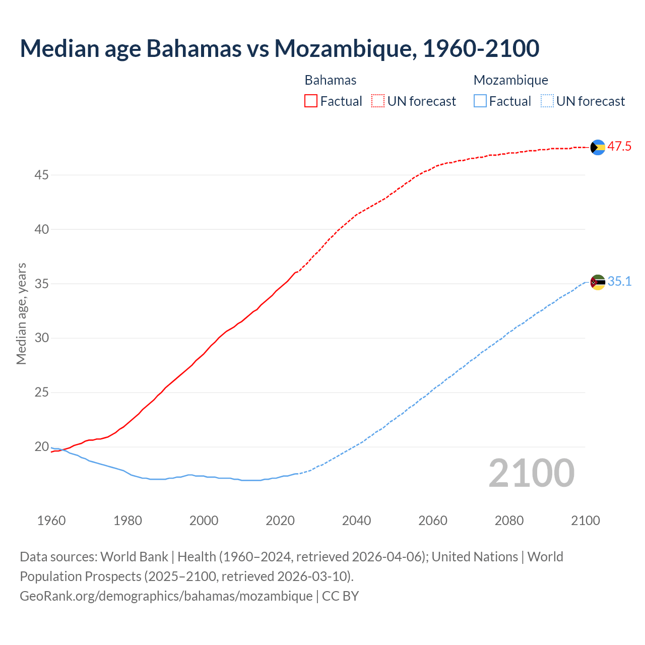 - The Bahamas is ranked 70/196 by median age (oldest to youngest) vs 189/196 for Mozambique.