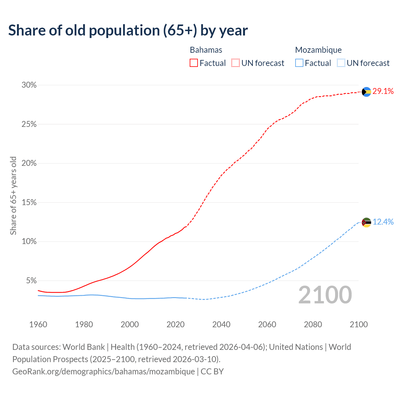 The share of older people aged 65 and over is 11.8% in the Bahamas and 2.75% in Mozambique. Life expectancy in the Bahamas compared to Mozambique .
