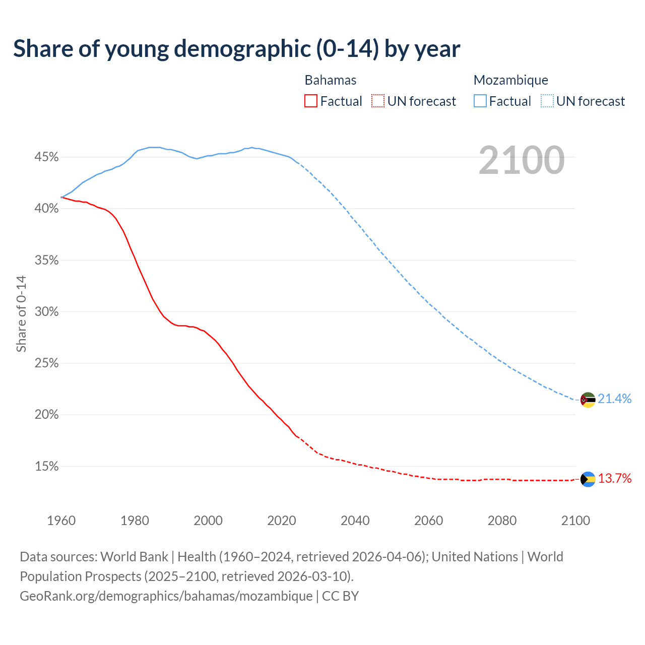- The share of young demographic (0-15 years old) in the Bahamas is 17.9% vs 44.5% in Mozambique.