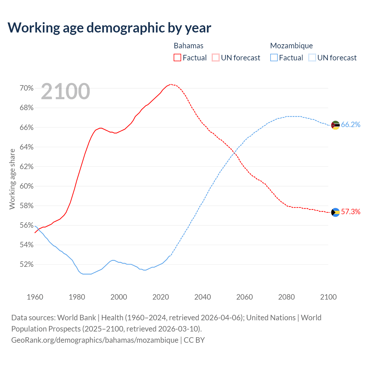 - The Bahamas has 285K working age adults (aged 15-64) vs 19.5M in Mozambique.