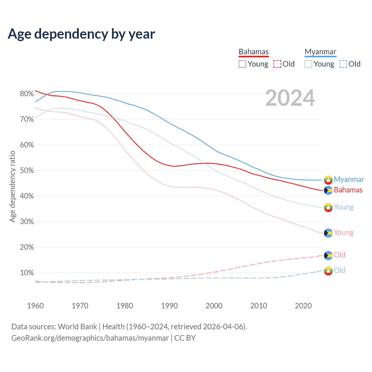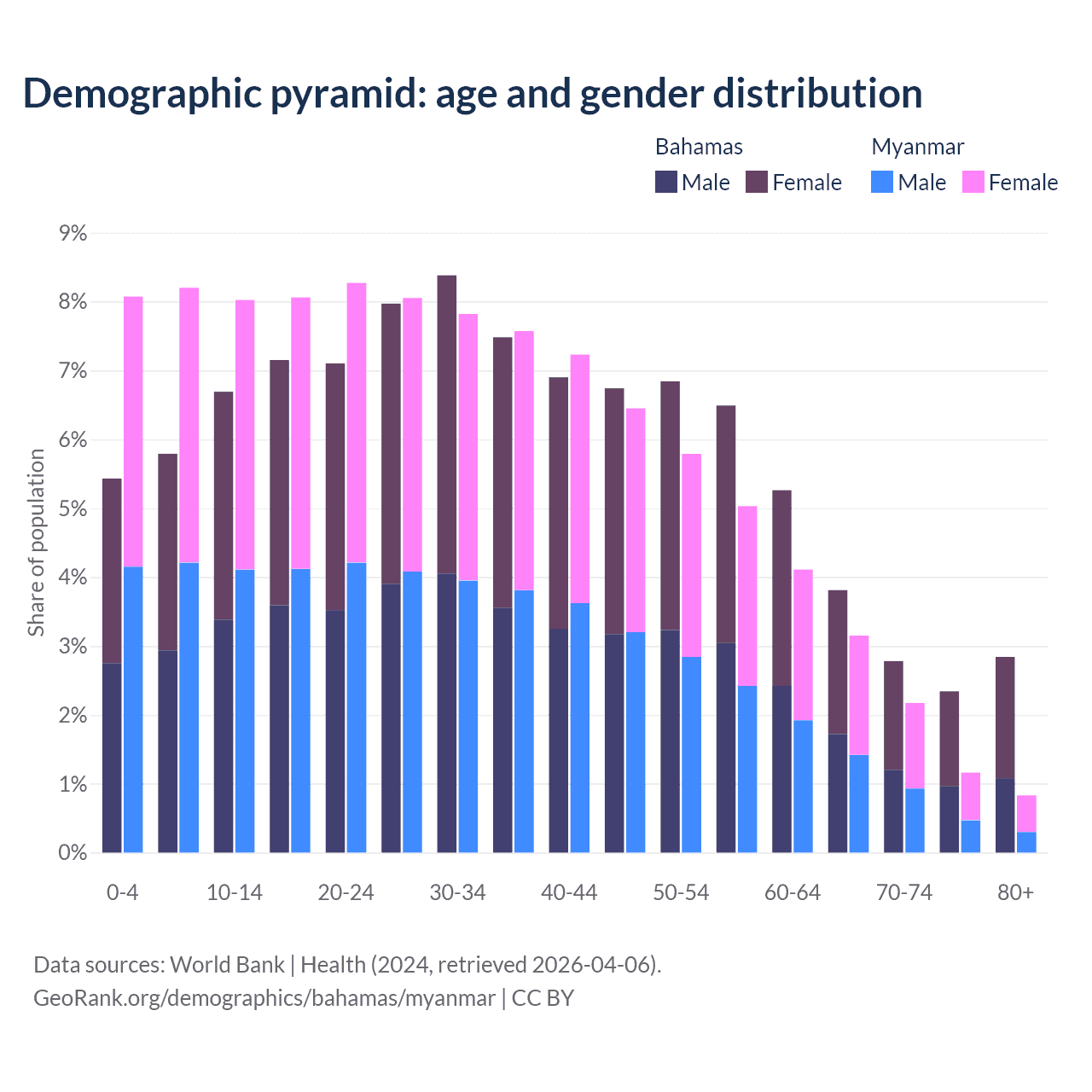 - The Bahamas is ranked 70/196 by median age (oldest to youngest) vs 96/196 for Myanmar.