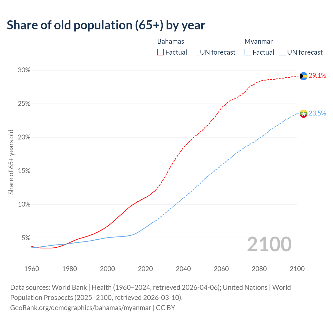 - The share of old-age demographic (65+) in the Bahamas is 11.8% vs 7.3% in Myanmar.