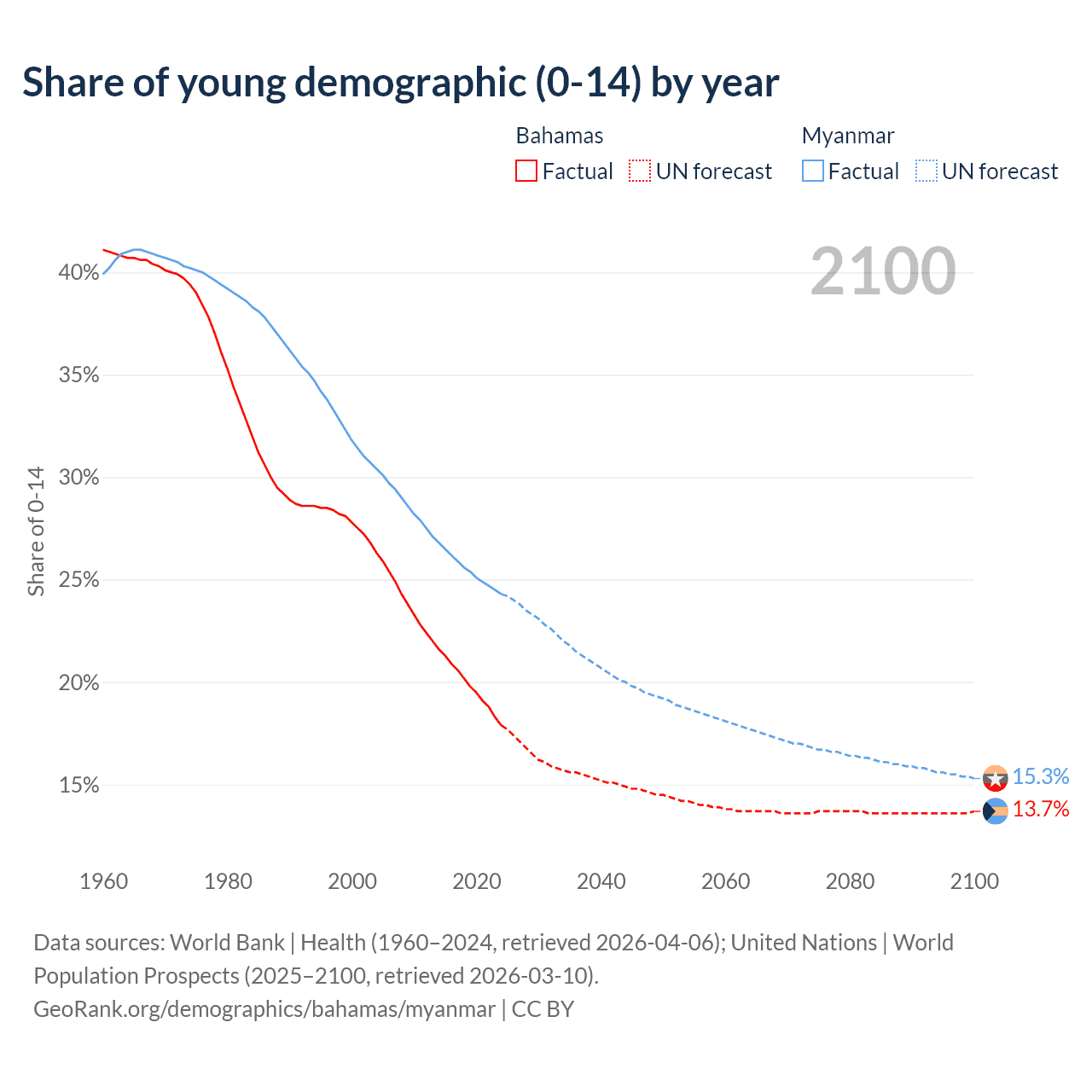 - The share of young demographic (0-15 years old) in the Bahamas is 17.9% vs 24.3% in Myanmar.