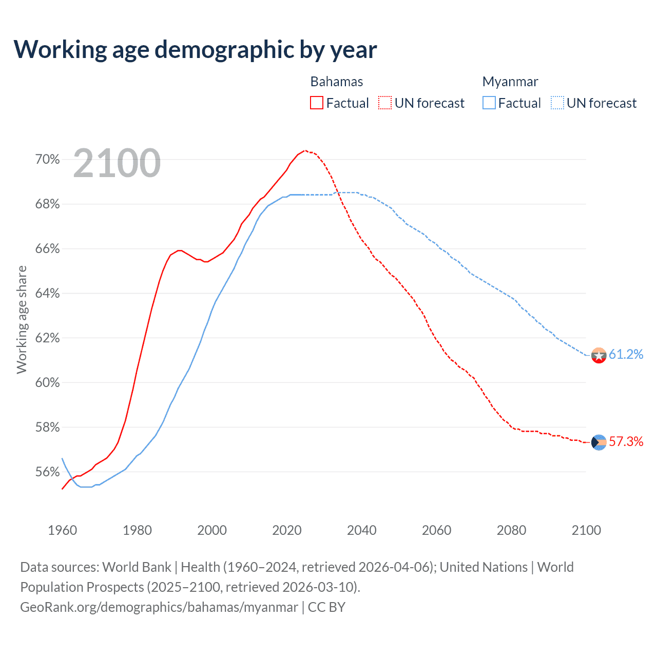 - The Bahamas has 285K working age adults (aged 15-64) vs 37.8M in Myanmar.