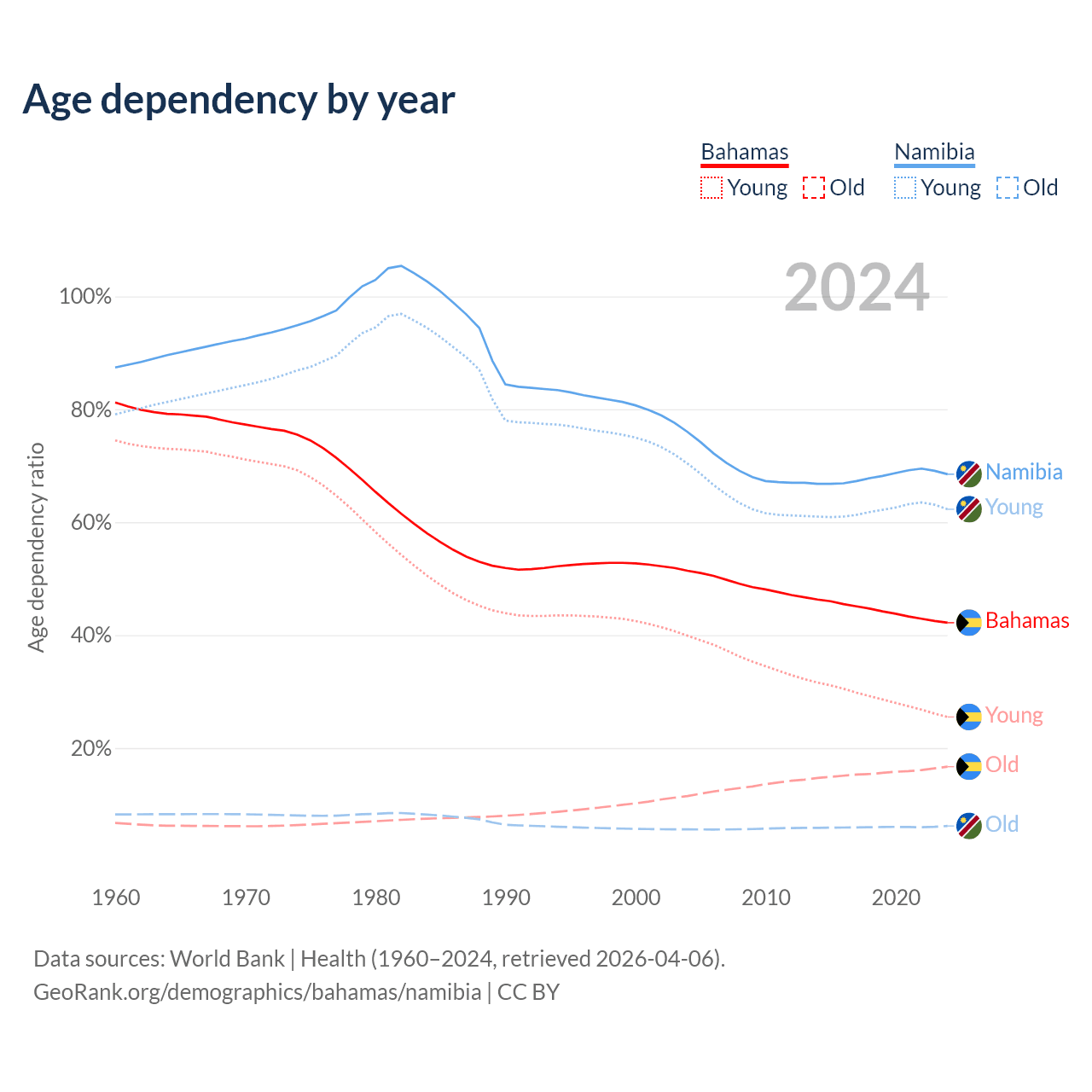 - The share of old-age demographic (65+) in the Bahamas is 11.8% vs 3.67% in Namibia.
