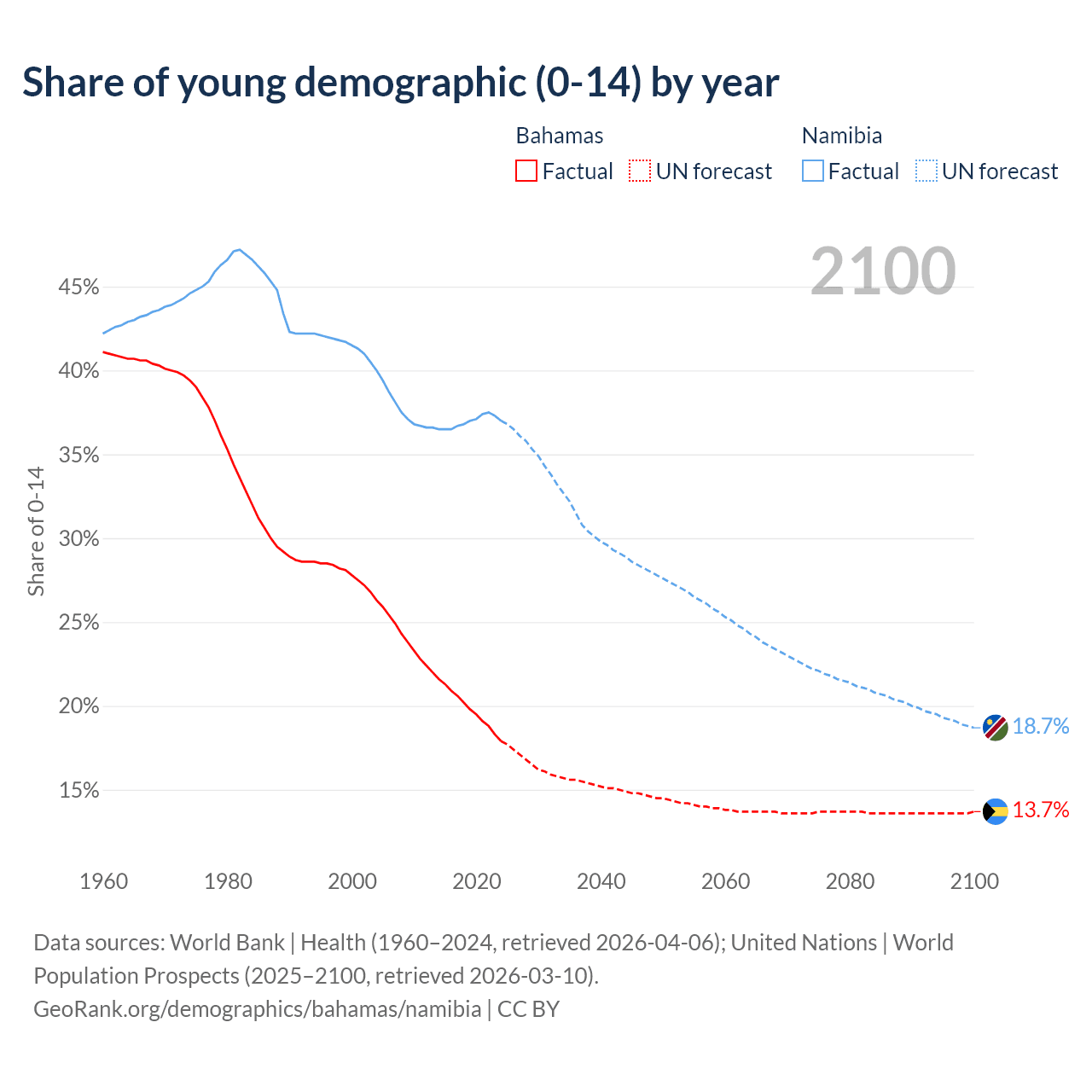 - The share of young demographic (0-15 years old) in the Bahamas is 17.9% vs 37% in Namibia.