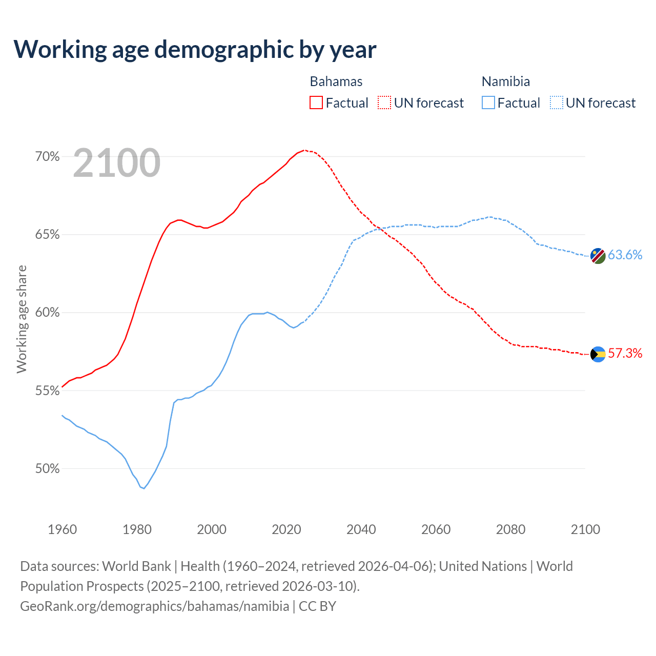 - The Bahamas has 285K working age adults (aged 15-64) vs 1.88M in Namibia.