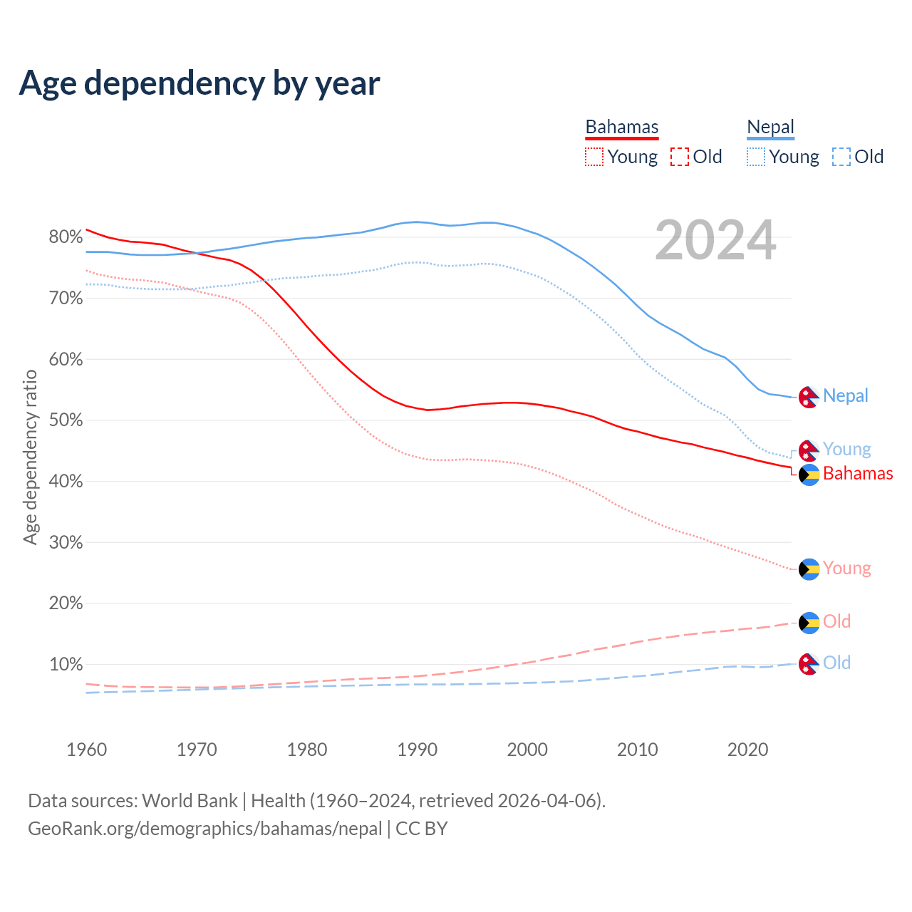 - The share of old-age demographic (65+) in the Bahamas is 11.8% vs 6.5% in Nepal.