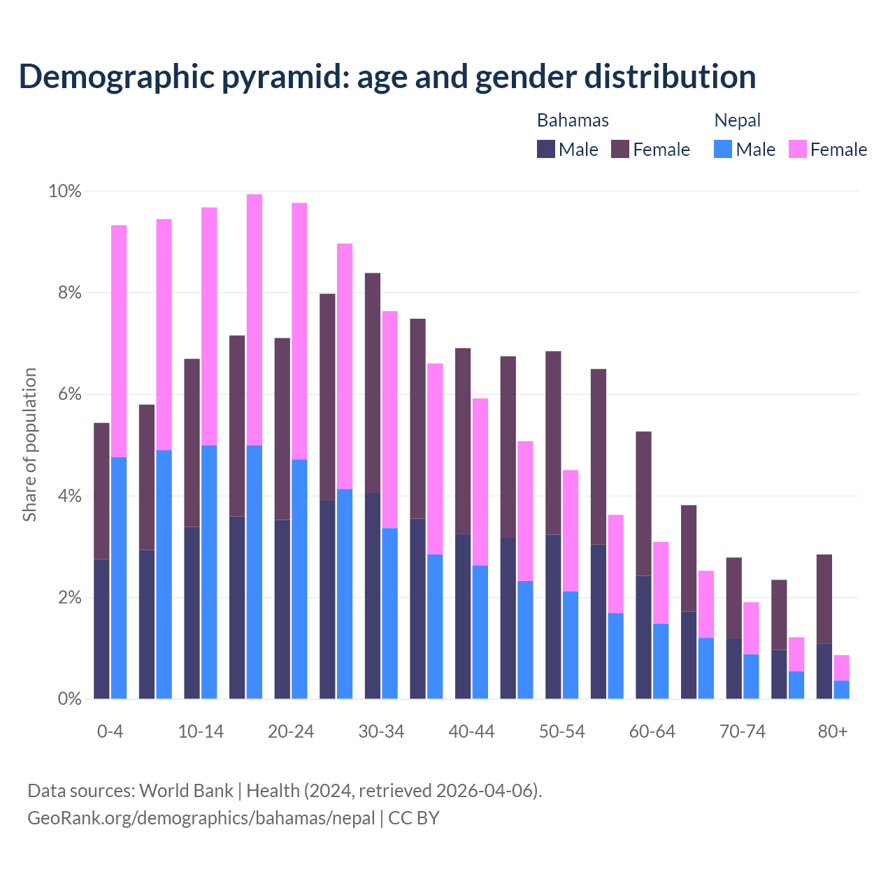 - The Bahamas is ranked 70/196 by median age (oldest to youngest) vs 127/196 for Nepal.
