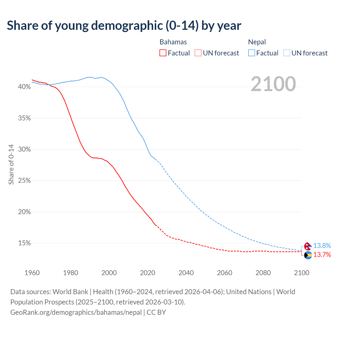 - The share of young demographic (0-15 years old) in the Bahamas is 17.9% vs 28.4% in Nepal.