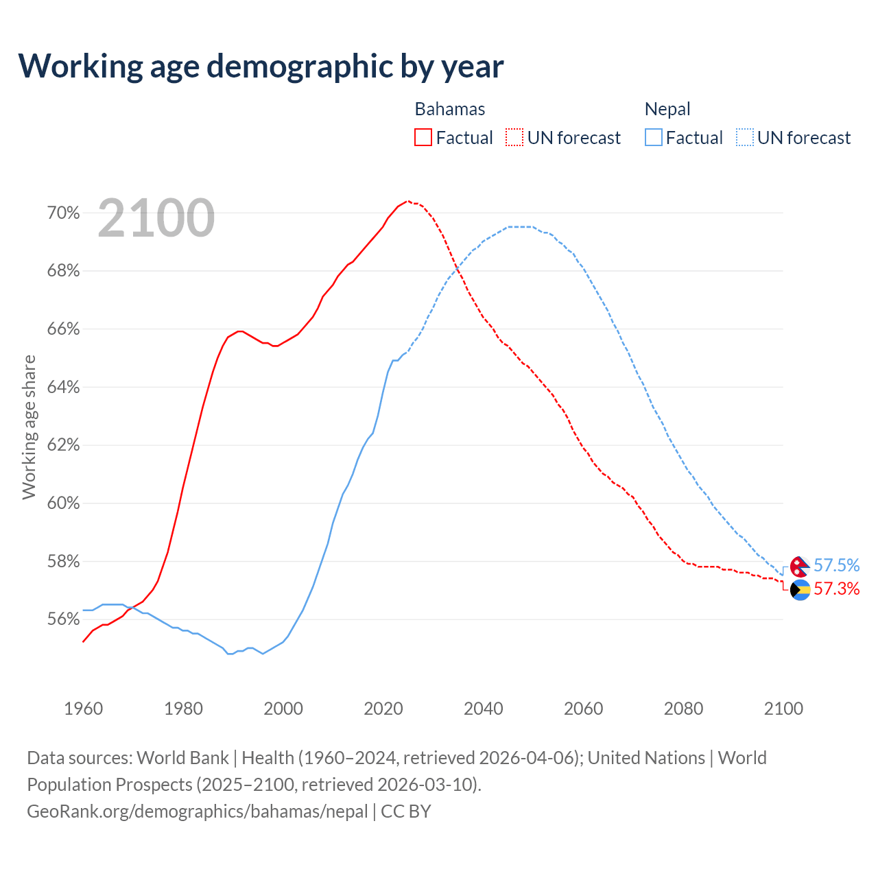 - The Bahamas has 285K working age adults (aged 15-64) vs 19.3M in Nepal.