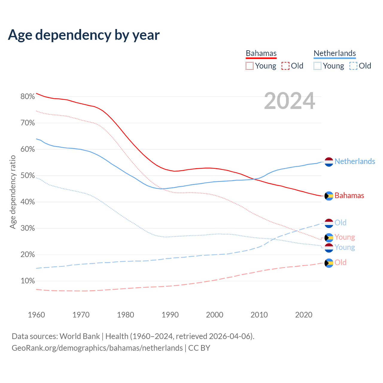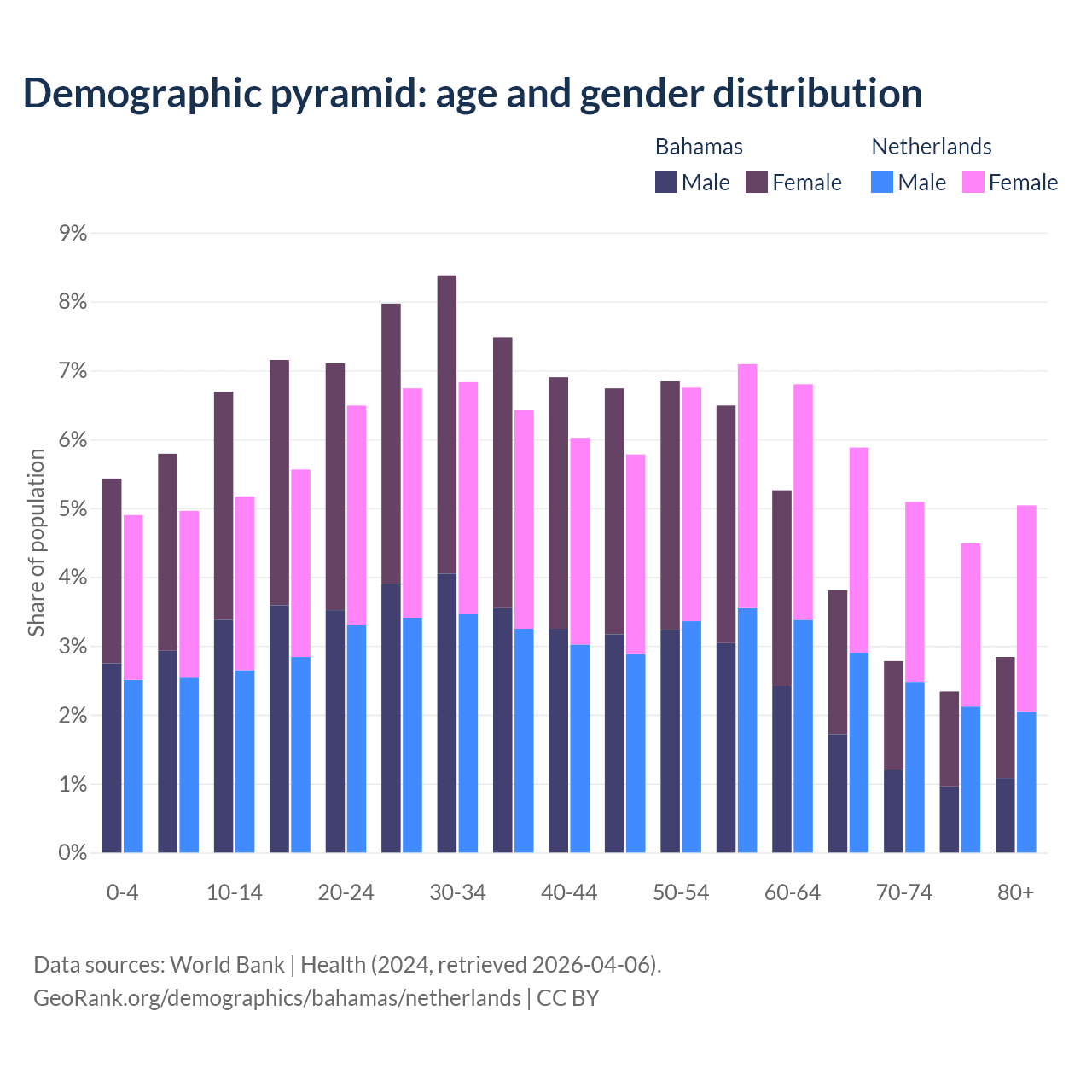 - The Bahamas is ranked 70/196 by median age (oldest to youngest) vs 33/196 for the Netherlands.