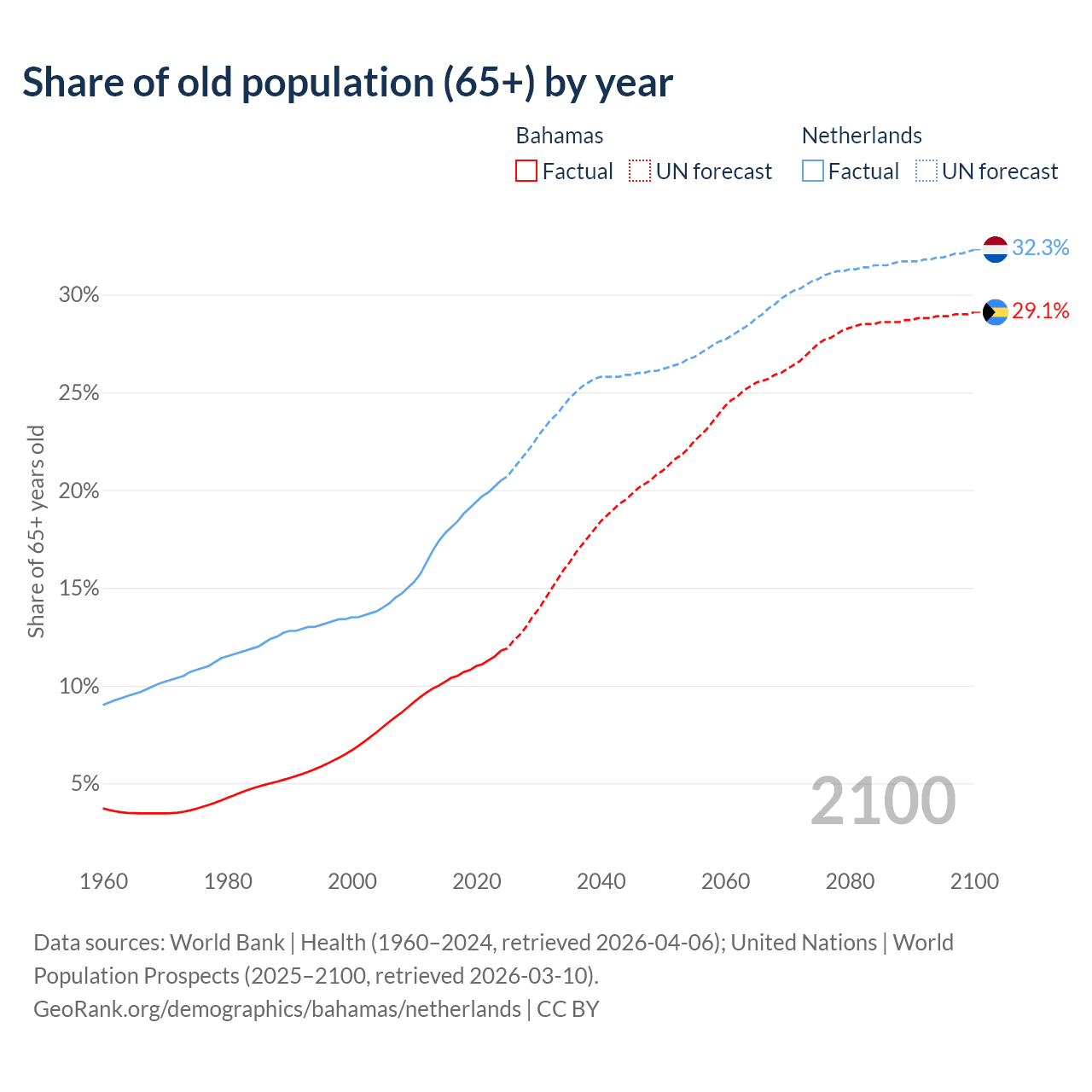 The share of older people aged 65 and over is 11.8% in the Bahamas and 20.5% in the Netherlands. Life expectancy in the Bahamas compared to the Netherlands .