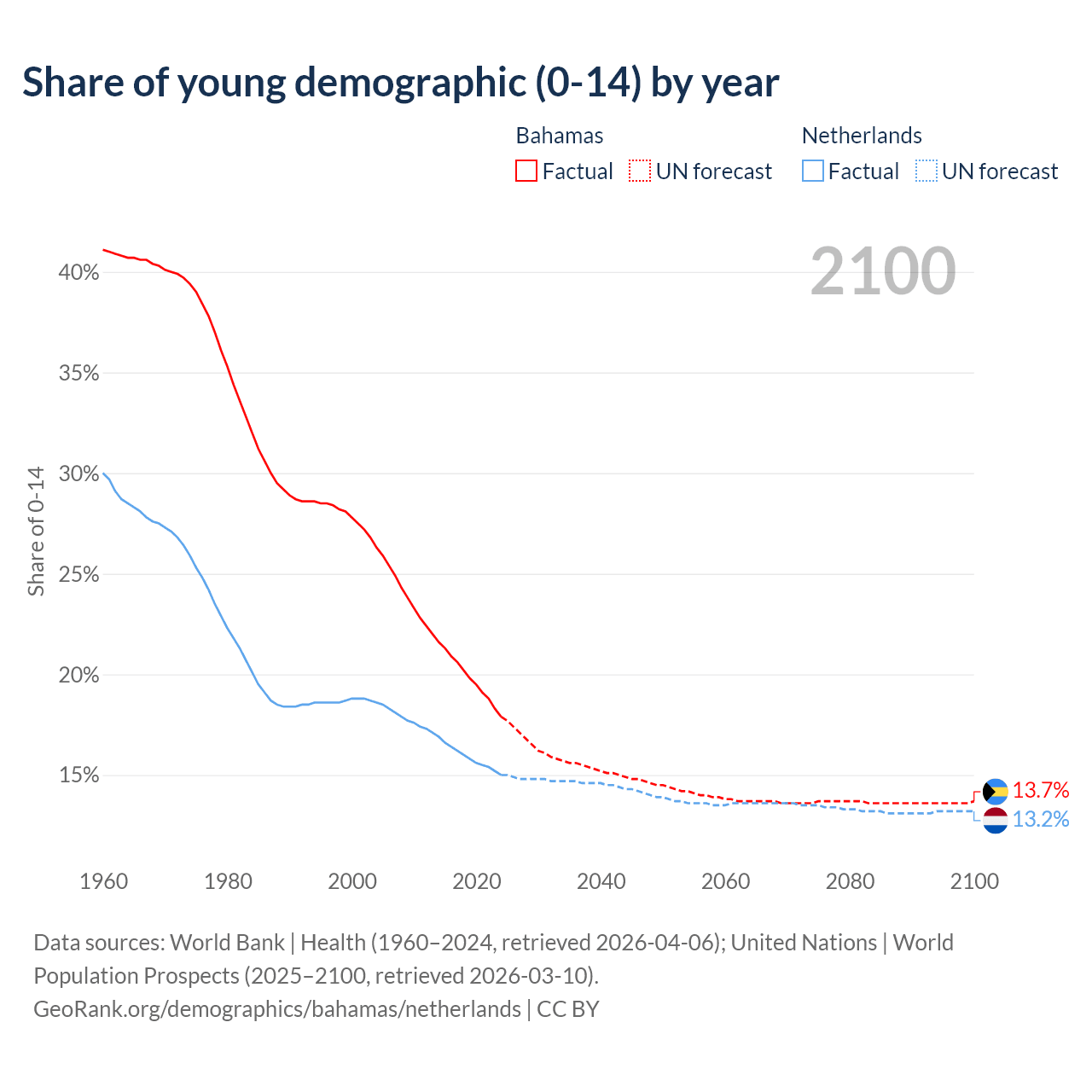 - The share of young demographic (0-15 years old) in the Bahamas is 17.9% vs 15% in the Netherlands.