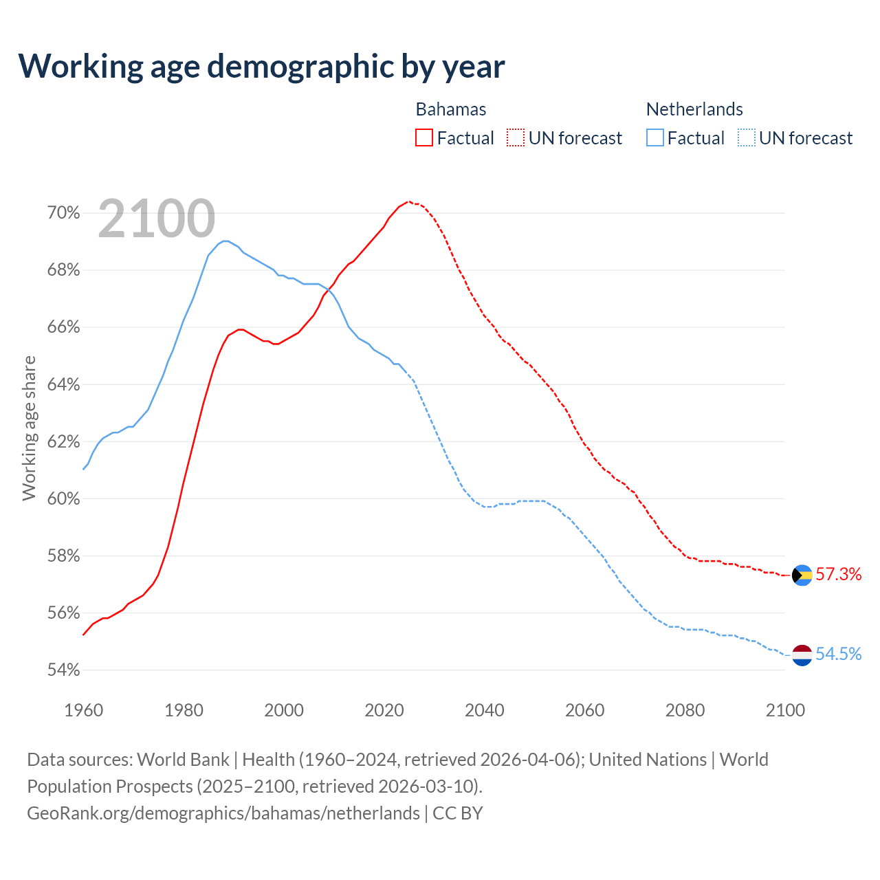 - The Bahamas has 285K working age adults (aged 15-64) vs 11.8M in the Netherlands.
