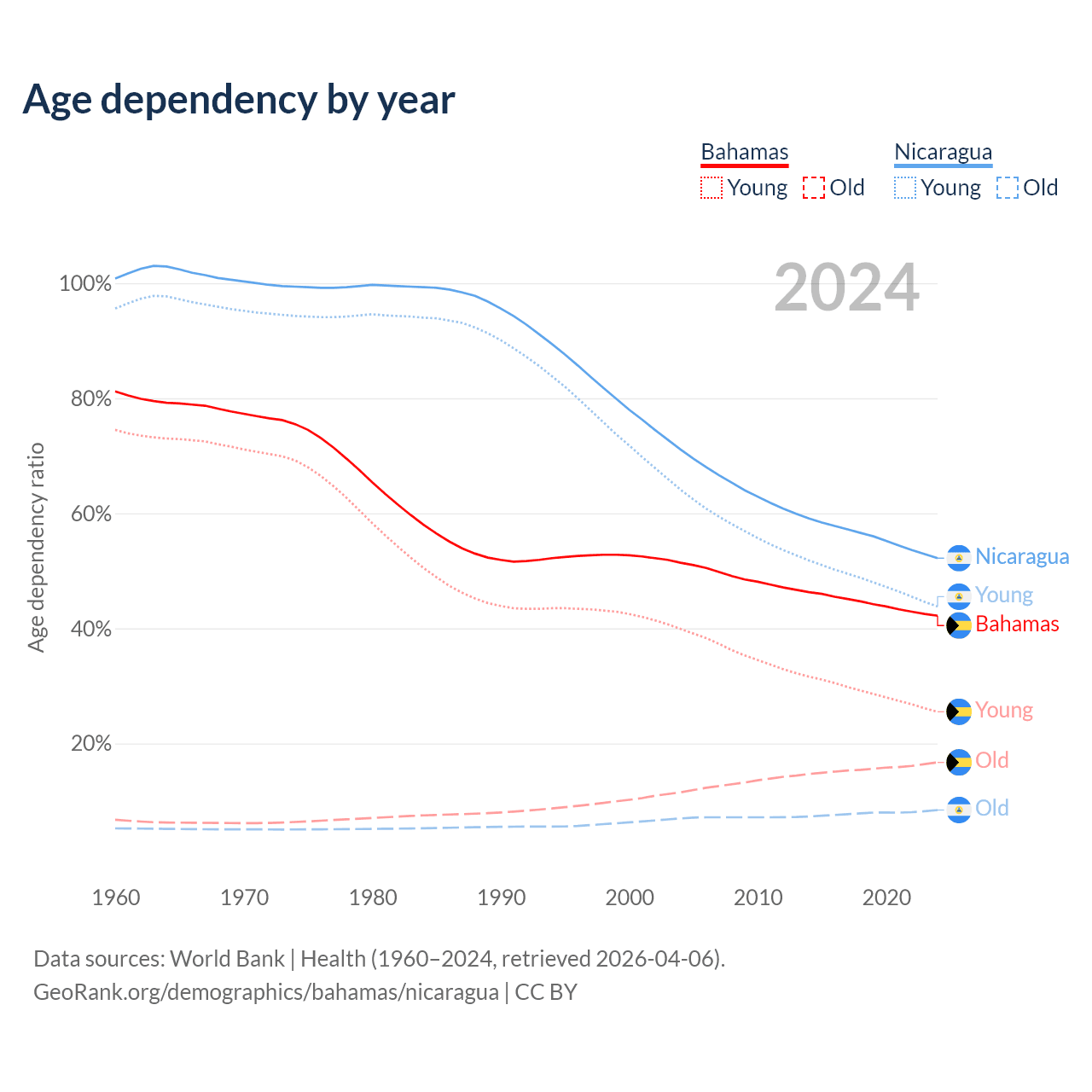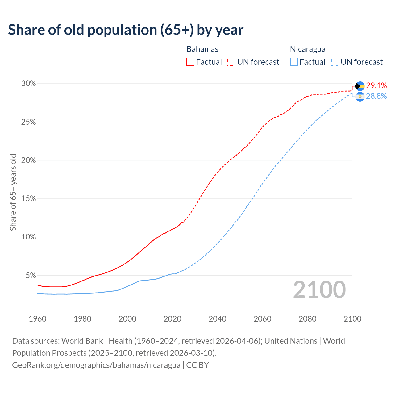 The share of older people aged 65 and over is 11.8% in the Bahamas and 5.53% in Nicaragua. Life expectancy in the Bahamas compared to Nicaragua .