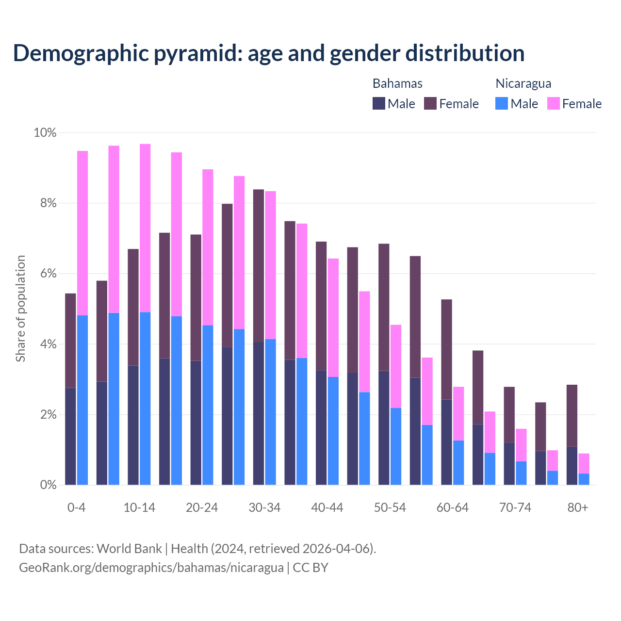 - The Bahamas is ranked 70/196 by median age (oldest to youngest) vs 125/196 for Nicaragua.