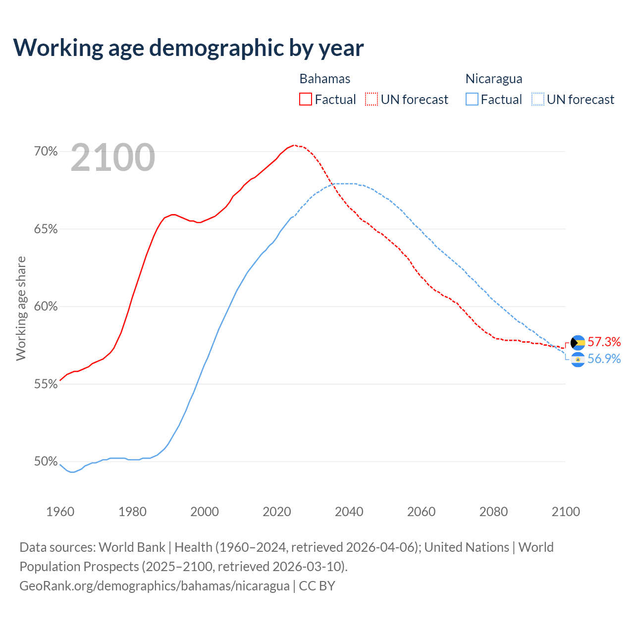 - The Bahamas has 285K working age adults (aged 15-64) vs 4.68M in Nicaragua.