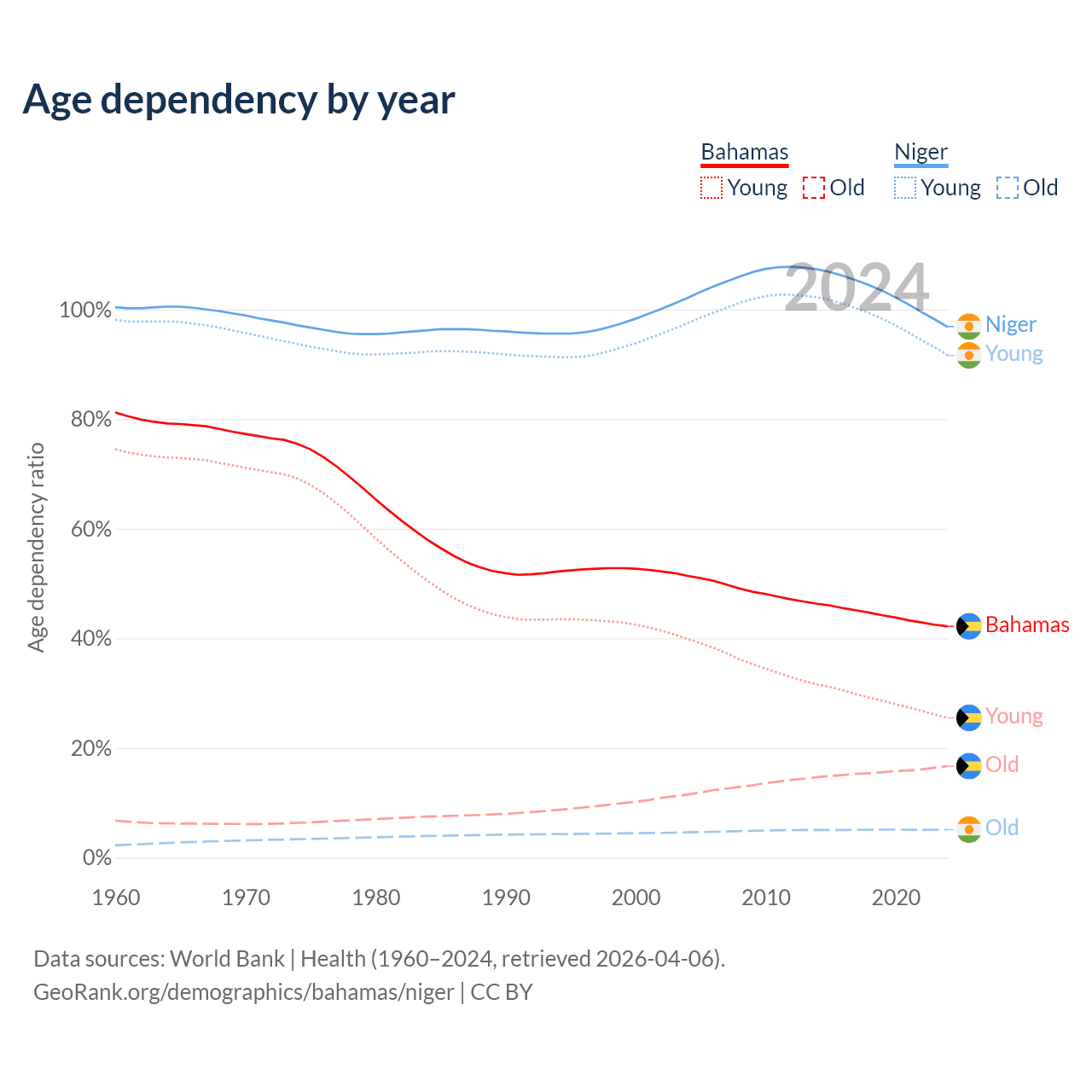 - The share of old-age demographic (65+) in the Bahamas is 11.8% vs 2.59% in Niger.