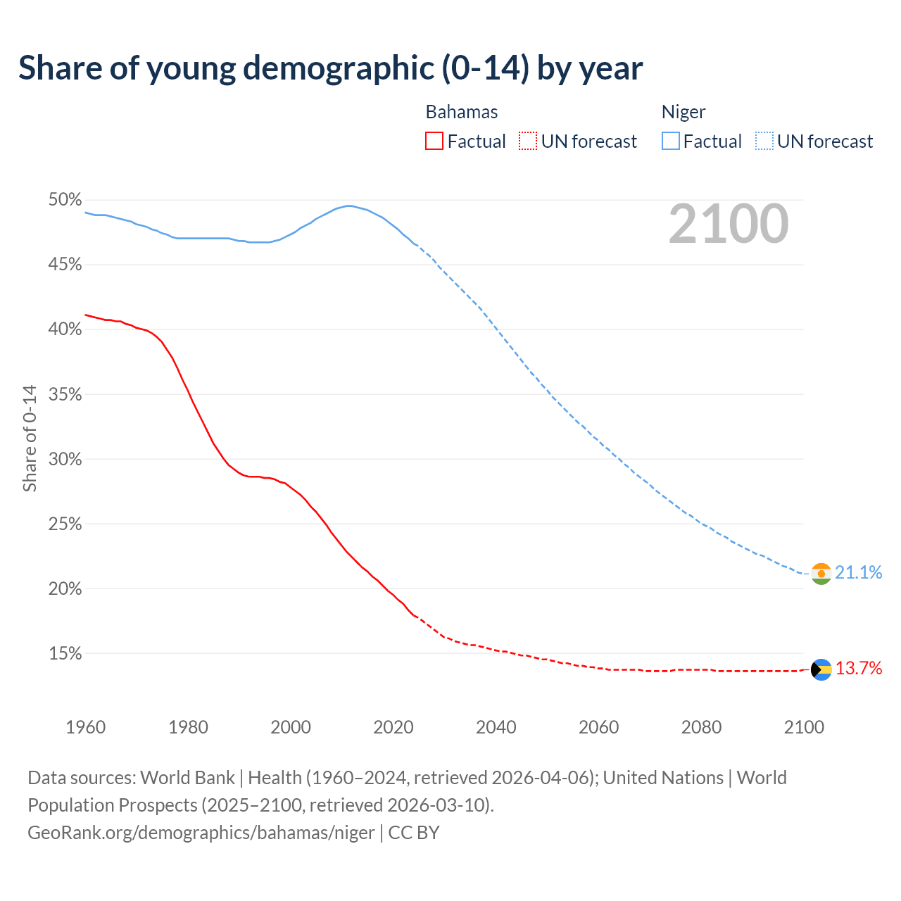 - The share of young demographic (0-15 years old) in the Bahamas is 17.9% vs 46.6% in Niger.