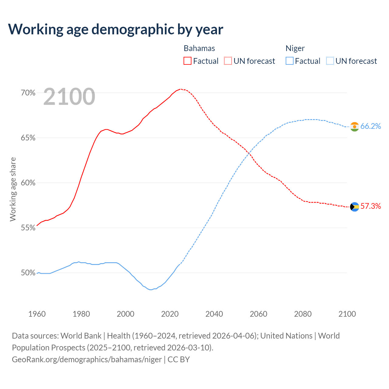 - The Bahamas has 285K working age adults (aged 15-64) vs 14.8M in Niger.