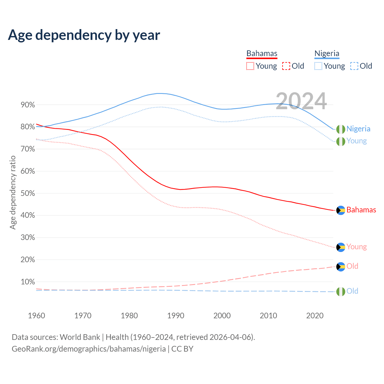 - The Bahamas is ranked 70/196 by median age (oldest to youngest) vs 178/196 for Nigeria.