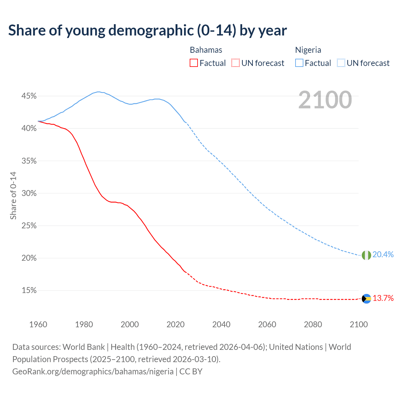 - The share of young demographic (0-15 years old) in the Bahamas is 17.9% vs 41% in Nigeria.