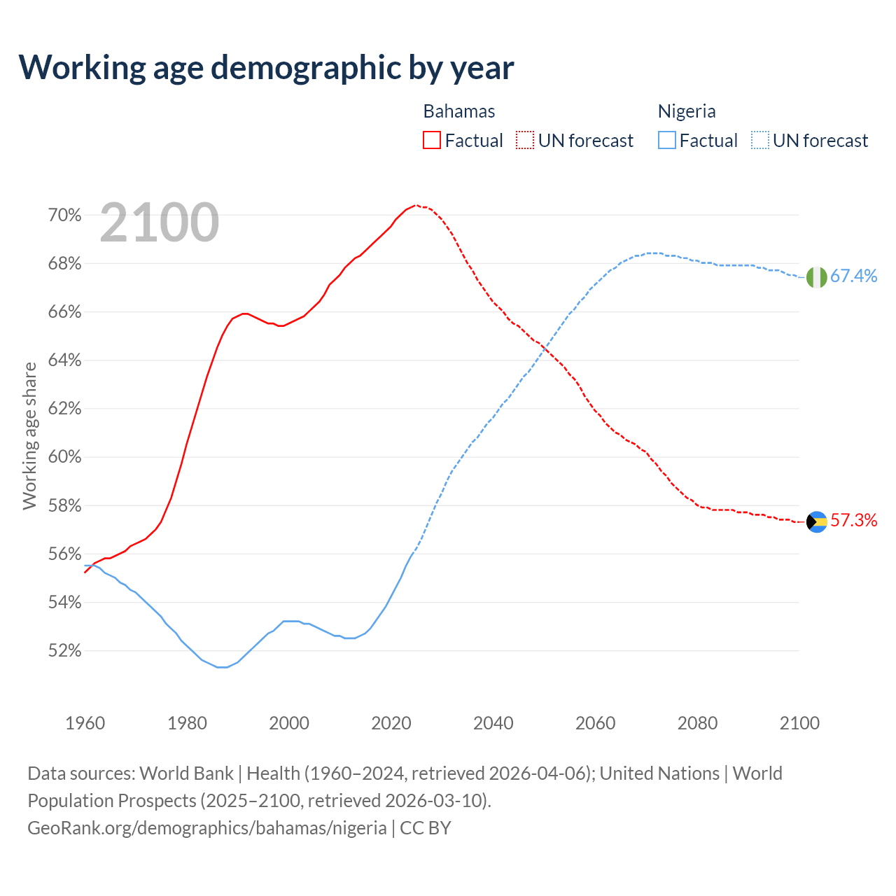 Median age Bahamas vs Nigeria, 1960-2100