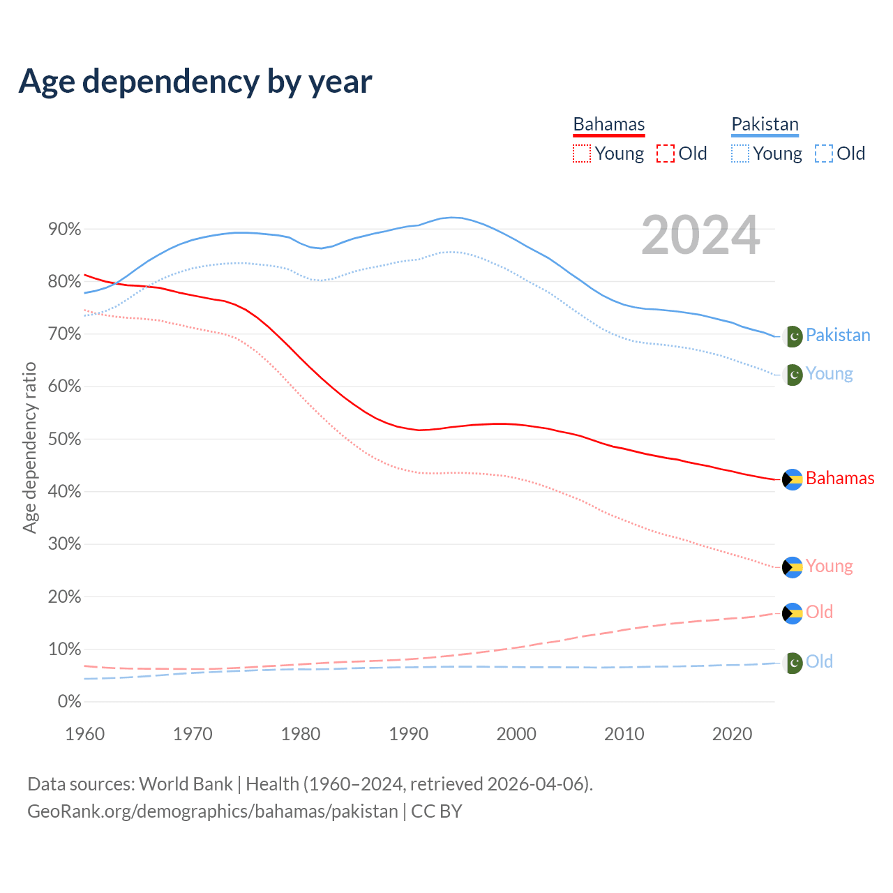 - The share of old-age demographic (65+) in the Bahamas is 11.8% vs 4.28% in Pakistan.