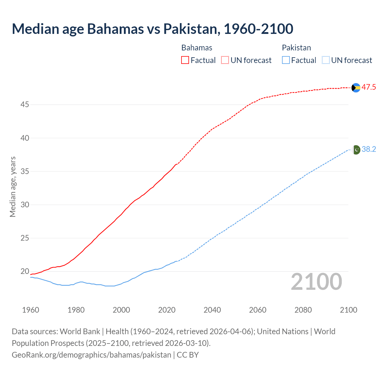 Median age Bahamas vs Pakistan, 1960-2100