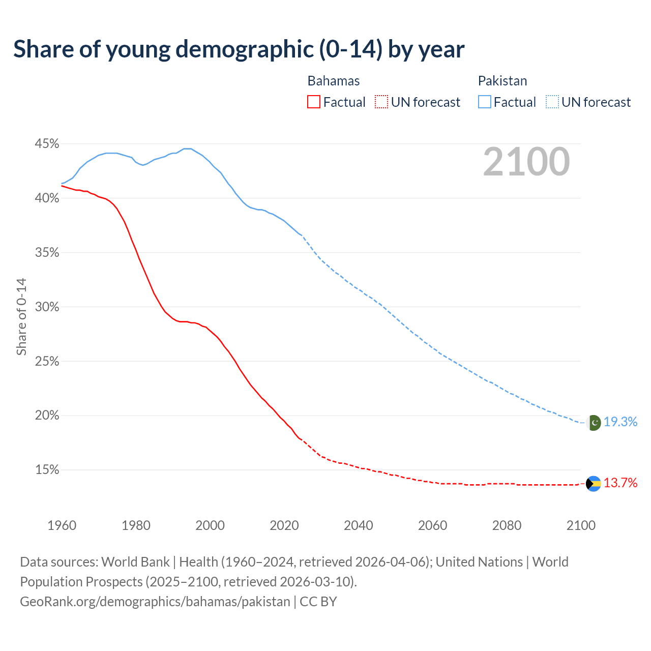 - The share of young demographic (0-15 years old) in the Bahamas is 17.9% vs 36.7% in Pakistan.