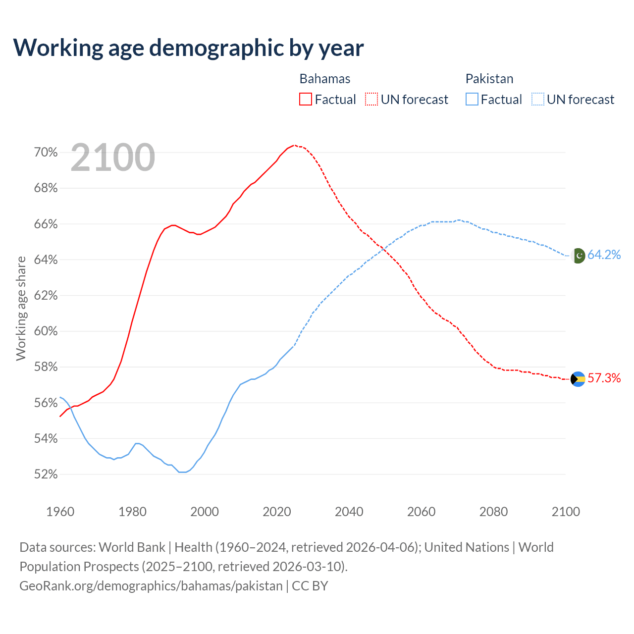 - The Bahamas has 285K working age adults (aged 15-64) vs 154M in Pakistan.