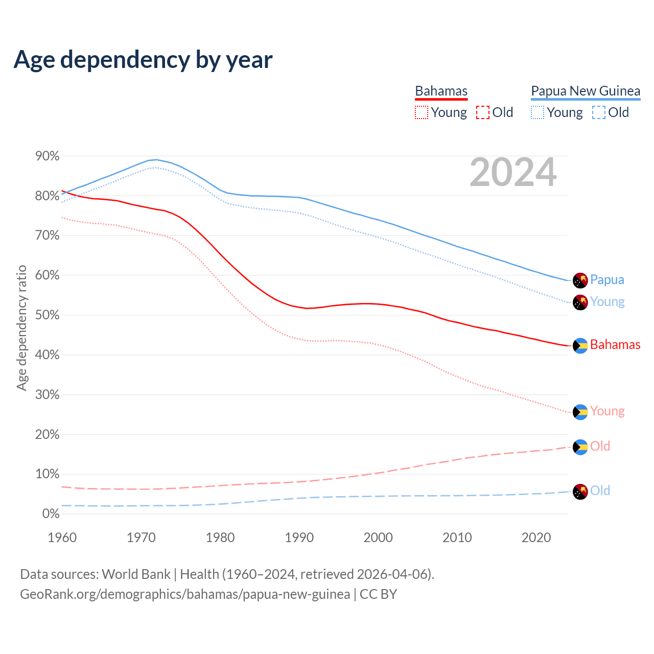 - The share of old-age demographic (65+) in the Bahamas is 11.8% vs 3.46% in Papua New Guinea.