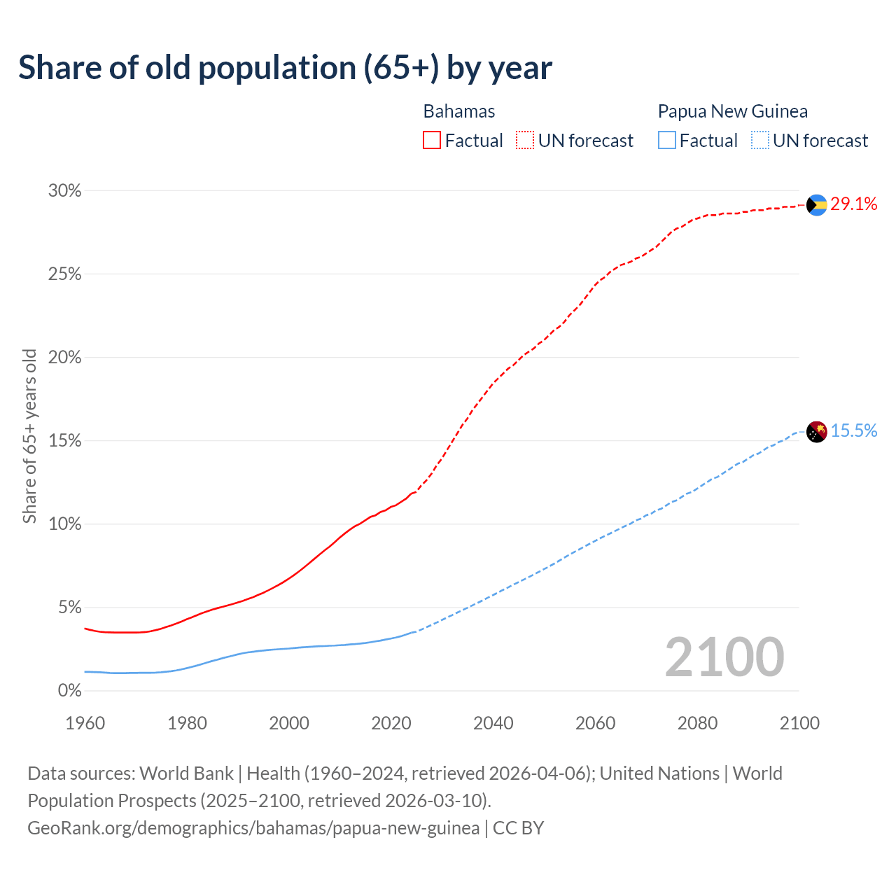 The share of older people aged 65 and over is 11.8% in the Bahamas and 3.46% in Papua New Guinea. Life expectancy in the Bahamas compared to Papua New Guinea .