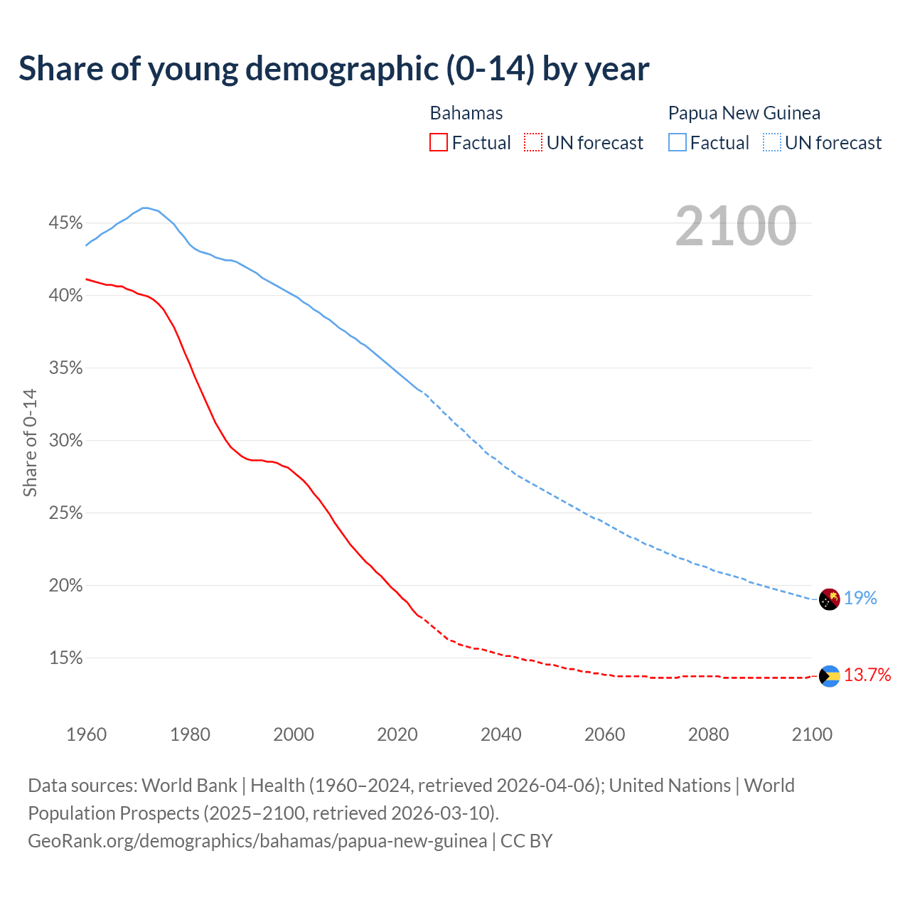 - The share of young demographic (0-15 years old) in the Bahamas is 17.9% vs 33.5% in Papua New Guinea.
