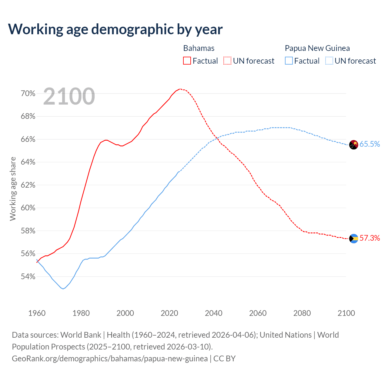 - The Bahamas has 285K working age adults (aged 15-64) vs 6.94M in Papua New Guinea.