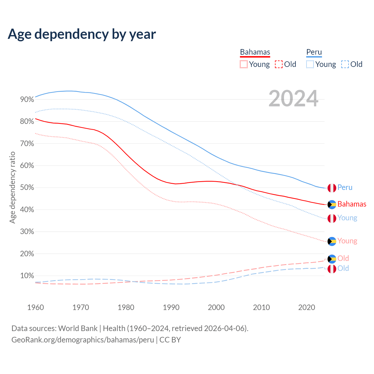 - The Bahamas is ranked 70/196 by median age (oldest to youngest) vs 97/196 for Peru.