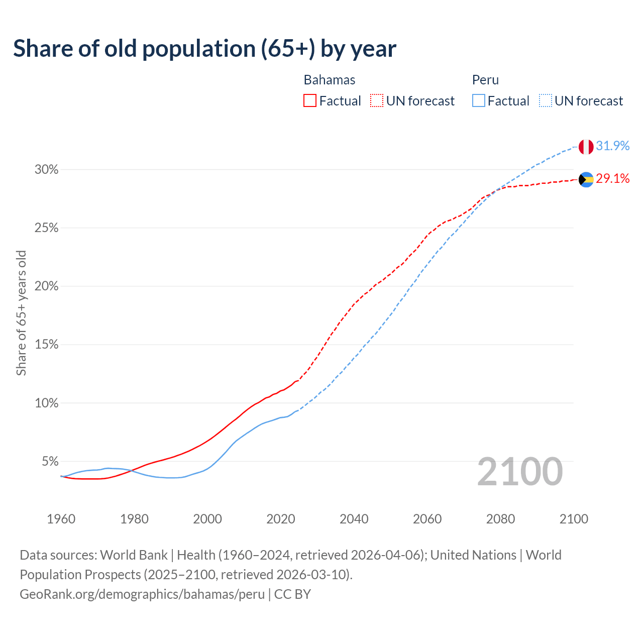 - The share of old-age demographic (65+) in the Bahamas is 11.8% vs 9.23% in Peru.